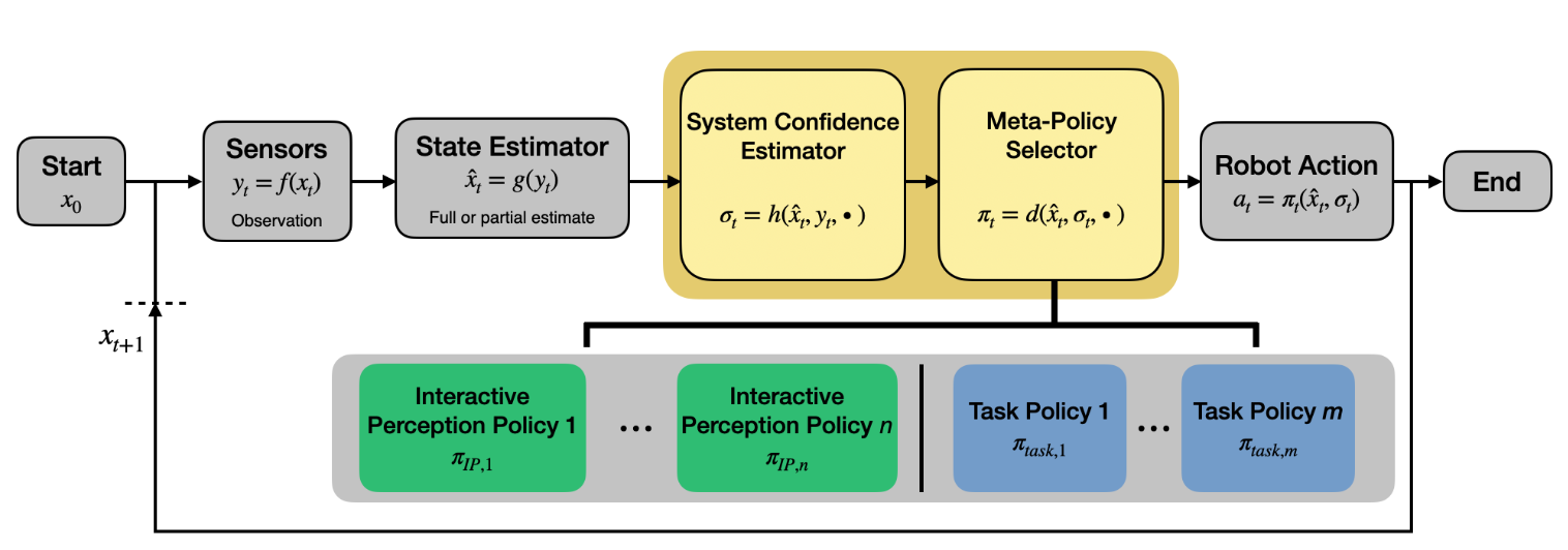 估计给出向量 ,表征 时刻的state estimation,所给出的估计为confidence和state viability。即使confidence处于较高水平,meta-policy也用分辨当前estimated state是否unsafe,unfamiliar (out of distribution),或者likely to lead to task failure - meta-policy通过procedure或learned得到,可以分为两种sub-policies,