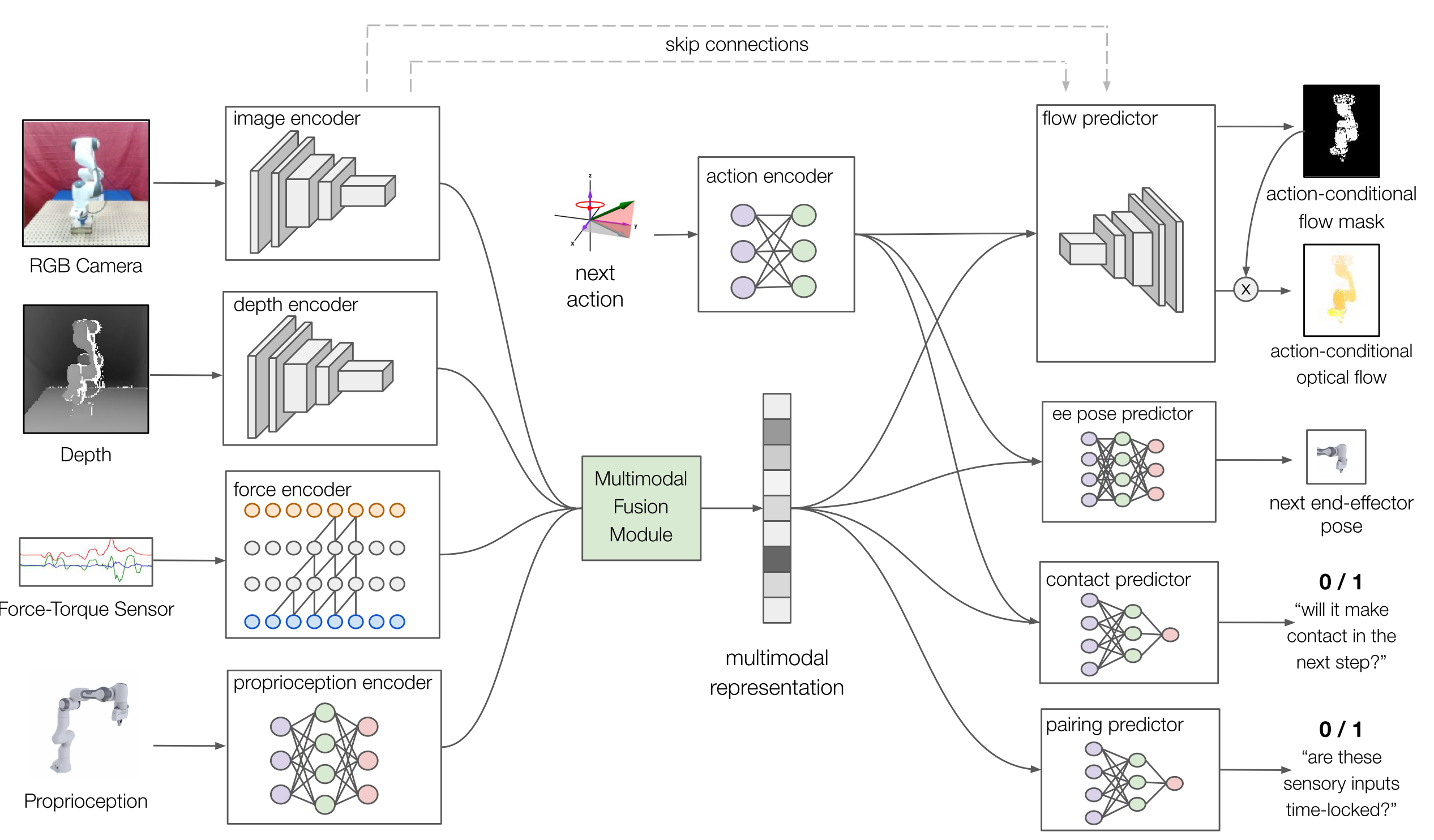 A variational model for multimodal representation learning from which a contact-rich manipulation policy can be learned.Demonstration of peg insertion tasks that effectively utilize both haptic and visual feedback for hole search, peg alignment, and insertion. Ablation studies comparing the effects of each modality on task performance.Evaluation of generalization to tasks with different peg geometry and of robustness to perturbation and sensor noise.
