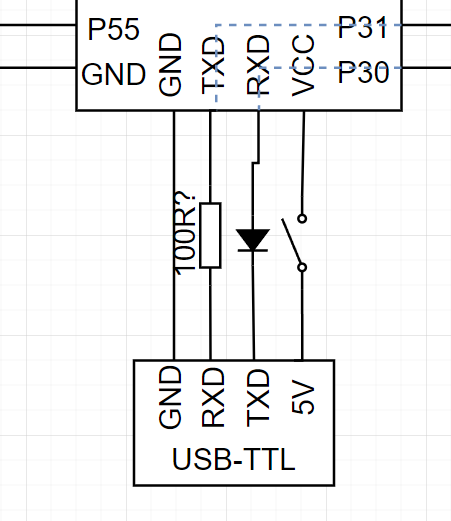 - 接线(二极管型号为IN5819、BAT54等,根据USB转串口芯片不同,没有电阻可能也能工作)